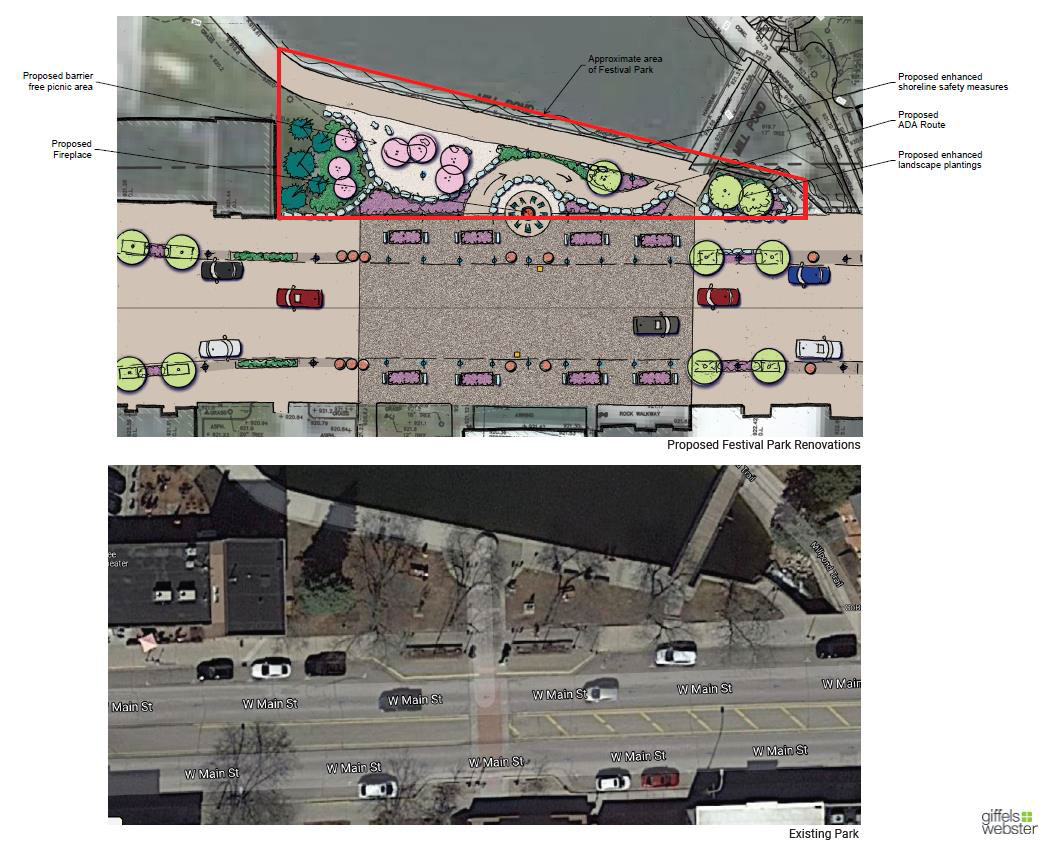 The project would establish an ADA-compliant route from Main Street and the new Festival Square into the park and connect to the rest of Millpond Park. Natural seats/benches would be located throughout Festival Park with a proposed fire pit feature extending activity at the park throughout the year.