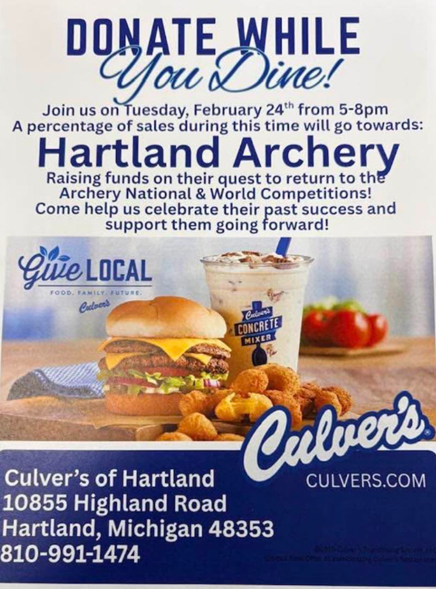 A “Donate While You Dine” event is set Tuesday, February 24th from 5 to 8pm at the Culver’s restaurant in Hartland, located at 10855 Highland Road/M-59.
