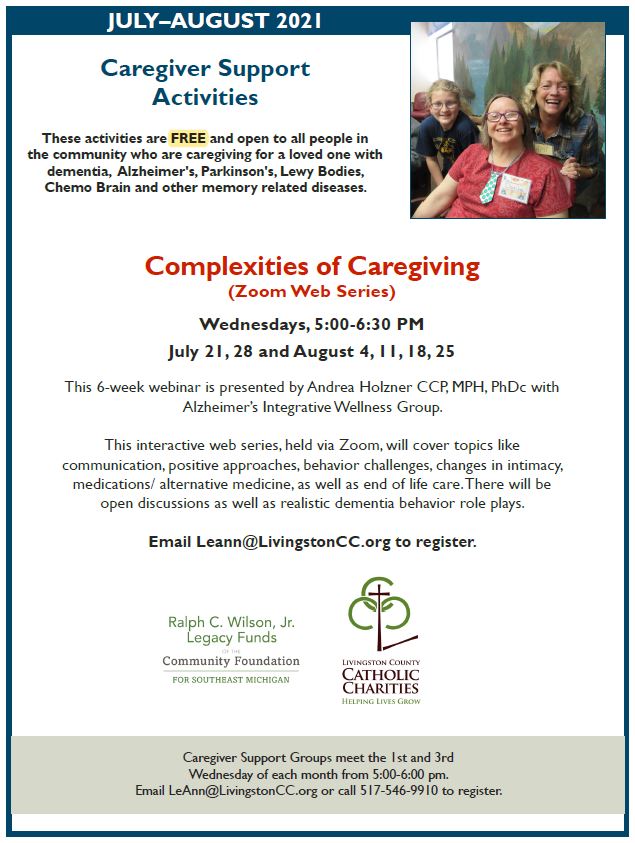 Complexities of Caregiving is a virtual online series that will be held on Wednesdays in July and August, starting next week. It’s part of caregiver support activities put on by Livingston County Catholic Charities that are offered free to everyone in the community who is caring for a loved one with dementia, Alzheimer’s, Parkinson’s, Lewy Bodies, chemo brain, and other memory-related diseases.