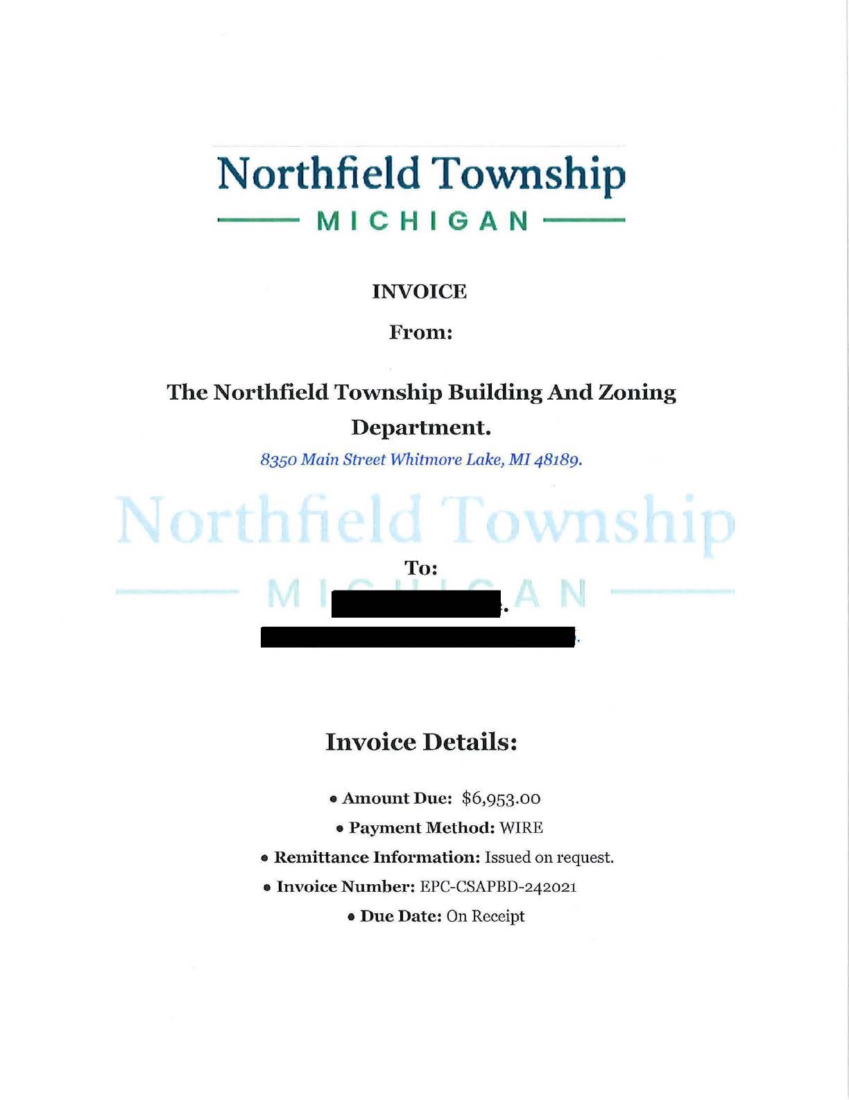 Recently, two developers with active development applications with the township have received emails from the "Northfield Township Building and Zoning Department" requesting payment. The email requests payment by wire transfer and instructs the applicant to reply to the email for payment instructions.