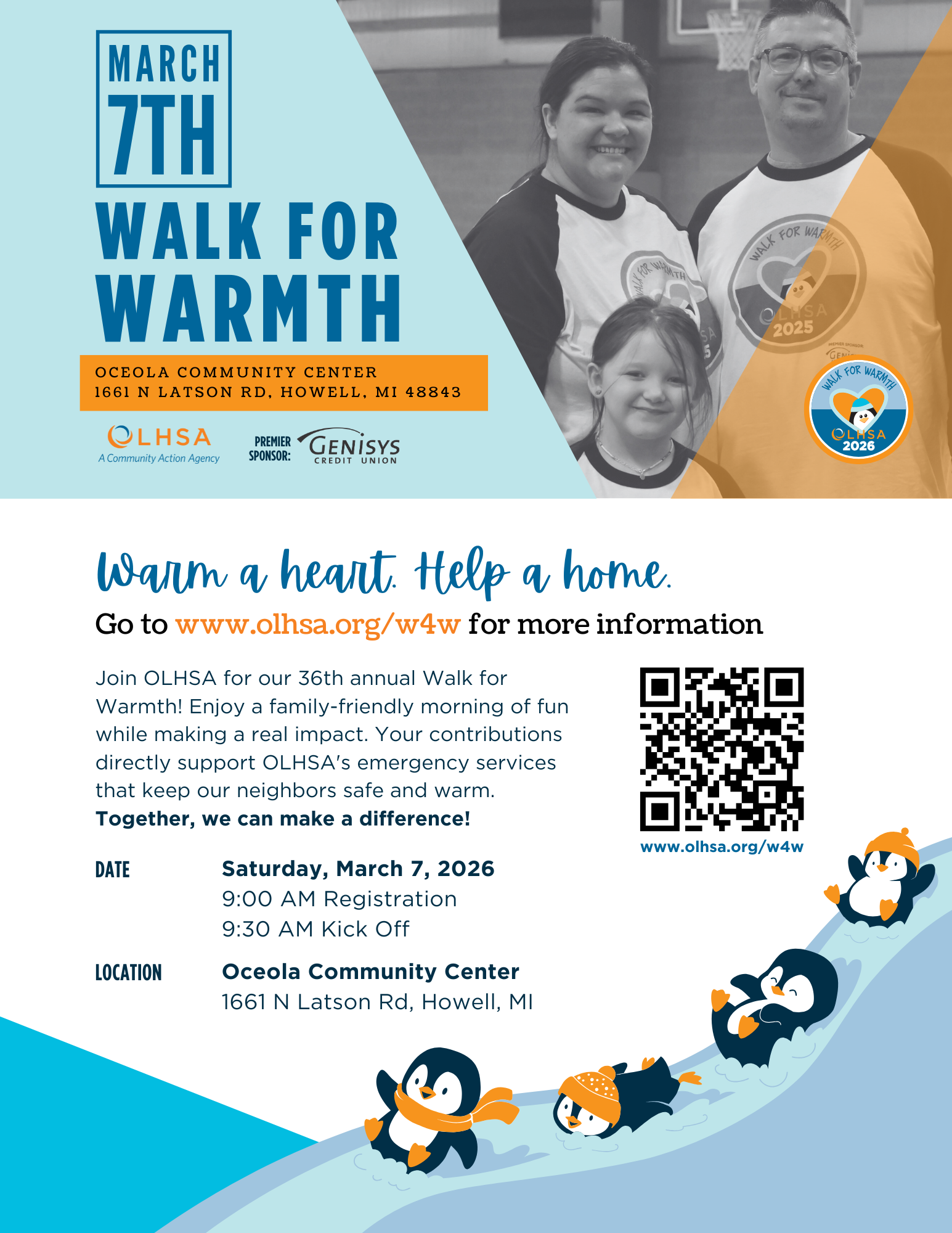 OLHSA, the Oakland Livingston Human Service Agency, is hosting its 36th annual Walk for Warmth event in Livingston County on Saturday, March 7th at the Oceola Community Center off Latson Road. Registration starts at 9am, with the event kicking off at 9:30am.