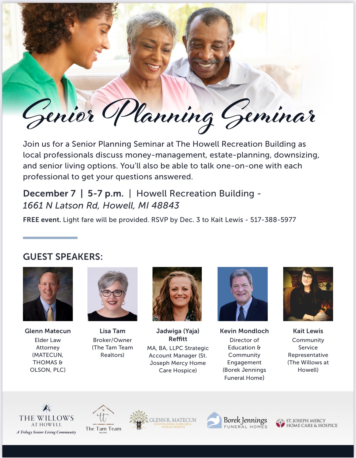 A Senior Planning Seminar will take place on December 7th from 5 to 7pm at the new Oceola Community Center at 1661 Latson Road operated by the Howell Area Parks & Recreation Authority.