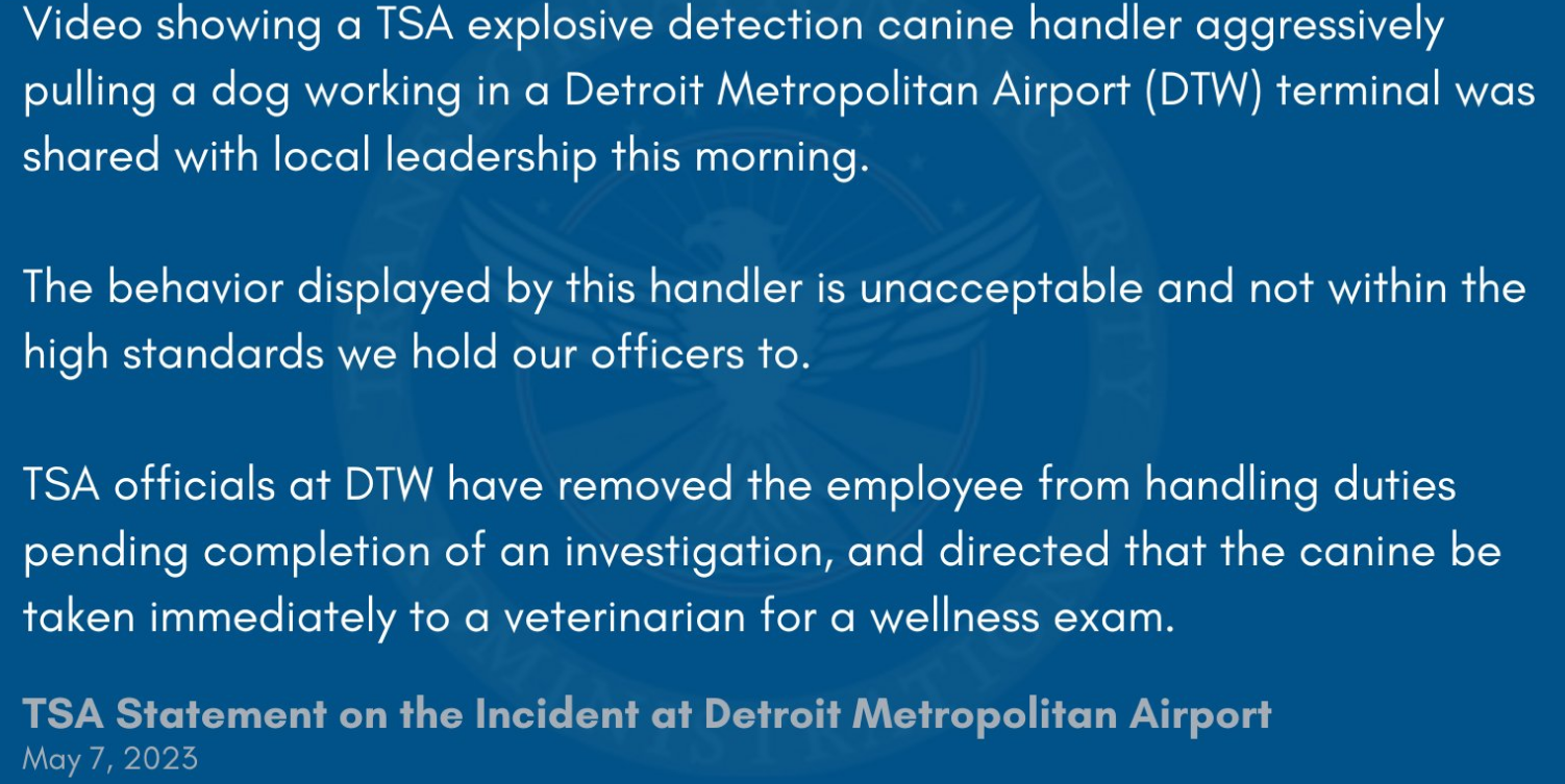 A statement from TSA was released after video footage emerged on May 7th on social media that showed the handler aggressively pulling the TSA explosive detection canine while in a DTW terminal.